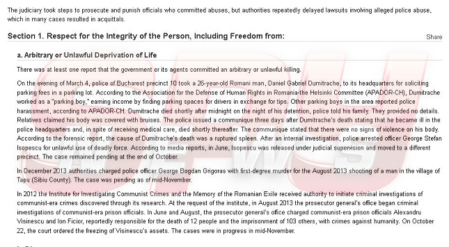 Raportul privitor la respectarea drepturilor omului în România, pe parcurul anului 2014, vorbeşte pe larg de cazul parcagiului Daniel Dumitrache, ucis de agentul George Isopescu (foto sus), în incinta Secţiei 10 Poliţie, la începutul lunii martie 2014. "Organele judiciare au făcut demersuri pentru a urmări şi pedepsi oficialii care au comis abuzuri, dar autorităţile au întârziat în mod repetat procesele privitoare la abuzurile poliţiei, procese care în cele mai multe cazuri se încheie cu achitări", se arată în raportul Departamentului de Stat, care a ajuns pe masa președintelui american Barack Obama.