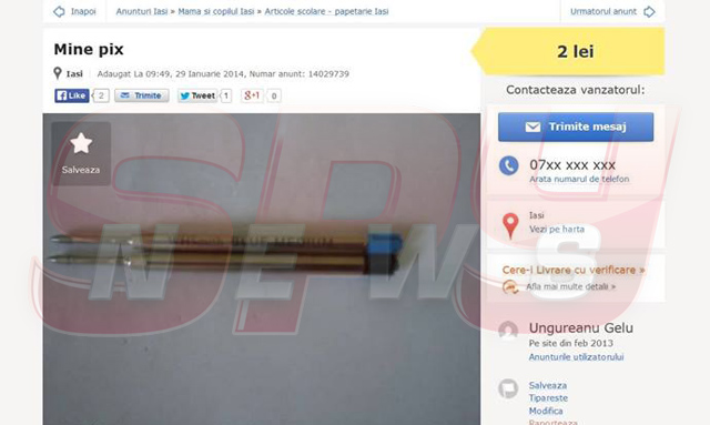 Pe unul dintre cele mai populare site-uri de profil din România, a apărut o ofertă "de excepţie". Un bărbat din Moldova, pe nume Gelu Ungureanu, s-a gândit să facă un ban cinstit şi a pus şi el un anunţ pentru a găsi cumpărători pentru două... mine de pix. A făcut şi o poză cu minunatele produse pe care îl vinde, la un super preţ, de doar 1 leu bucata, şi a aşteptat clienţii.