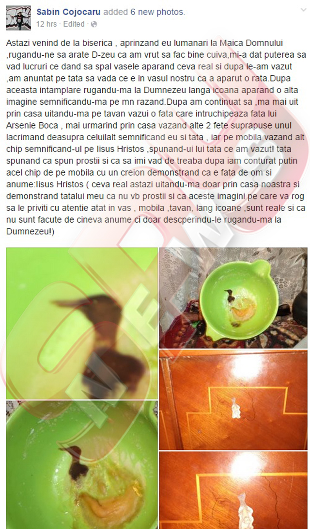 "Astăzi, când am venit de la biserică, aprinzând lumânări la Maica Domnului, m-am rugat să îmi arate Dumnezeu un semn că am vrut să fac bine cuiva. Mi-a dat putere să văd lucruri. În timp ce spălam vasele, am văzut într-un vas o raţă. După această întâmplare, rugându-mă la Dumnezeu lângă icoană, a apărut o altă imagine, semnificându-mă pe mine râzând. Am continuat să mă uit prin casă, iar pe tavan am văzut faţa lui Arsenie Boca. Apoi au apărut alte două feţe suprapuse, una lăcrimând deasupra celeilalte, semnificând eu şi tata. Pe mobilă este chipul lui Iisus Hristos", a scris Sabin, pe o rețea de socializare.