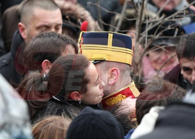 Pălăria neagră cu bolurile foarte mari îi acoperea perfect capul Romaniţei Iovan, astfel încât nimeni să nu poată citi durerea pe faţa ei. Irina, însă, nu s-a putut dezlipi aşa uşor de locul de veci în care se va odihni de acum înainte tatăl ei. Unul dintre cele mai emoţionante momente dela înmormântarea pilotului a fost atunci când pe cer s-a auzit un elicopter. Toată lumea a îndreptat privirea înspre el şi au început să aplaude când au văzut că din el erau aruncate mii de flori roşii care s-au aşternut ca un covor peste mormântul pilotului Adrian Iovan.