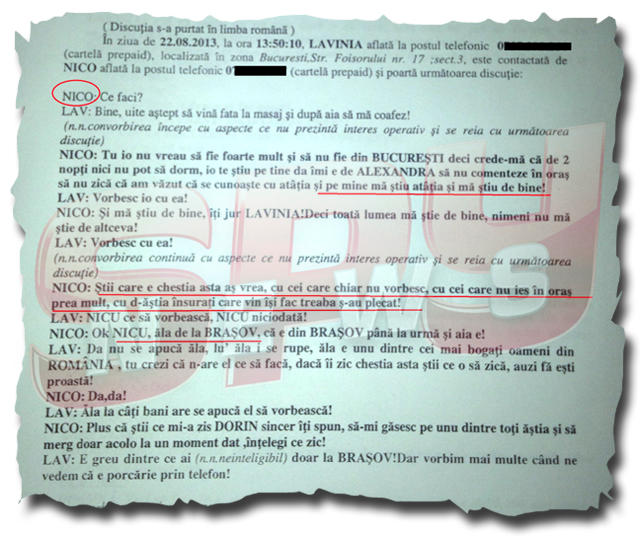 Conştientă de notorietatea ei, Rolla încerca să negocieze cu Lavinia Despina şi îi cerea acesteia să o pună în legătură cu bărbaţi care nu prea ies în oraș, să nu existe riscul să fie recunoscută. Mai mult decât atât, vedeta urma să fie pusă în legătură cu afaceristul braşovean Ioan Neculaie. "Tu, eu nu vreau să fie foarte mult şi să nu fie din Bucureşti. Crede-mă că de două nopţi nu pot să dorm, eu te cunosc pe tine, dar mi-e aşa de Alexandra, să nu comenteze în oraş, să nu vorbească. Am văzut că se cunoaşte cu atâţia şi pe mine mă ştiu de bine toţi! Aş vrea cu cei care chiar nu vorbesc, cu cei care nu ies în oraş prea mult, cu d-ăştia însuraţi, care vin, îşi fac treaba şi-au plecat!", este doar o parte din conversaţia interceptată de anchetatori, dintre Rolla Sparks şi Lavinia Despina.