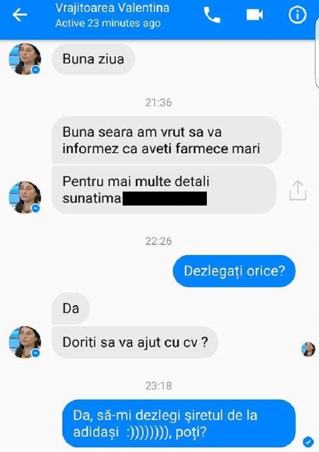 În încercarea de a-l "vrăji" pe un bărbat racolat în spaţiul virtual, Valentina aceasta l-a anunţat că are "farmece mari", iar potenţialul client - un poliţist cu simţul umorului - a întrebat-o: "Dezlegaţi orice? (...) Să-mi dezlegi şiretul de la adidaşi, poţi?"
