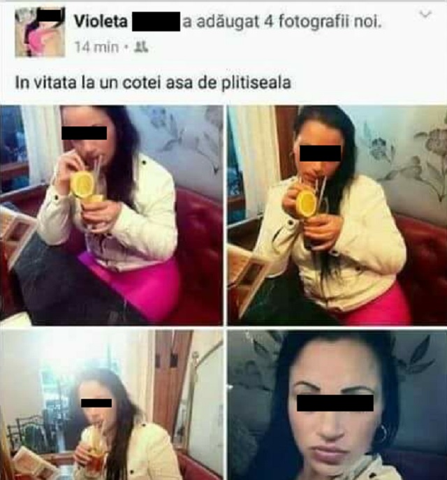 Obişnuită să posteze zilnic imagini în diferite ipostaze - fie pe stradă, cu pantalonii din vinilin care pocnesc pe ea, fie din baie sau dormitor, etalându-şi buzele botoxate şi spâncenele desenate frumos cu stânga - Violeta a încercat să le facă în ciudă "ţăranilor din România", cu nişte poze realizate într-un restaurant.
