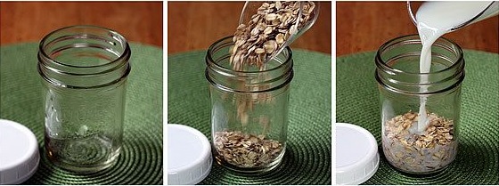 Într-un borcan puneţi fulgii de ovăz. Peste ei, turnaţi laptele.