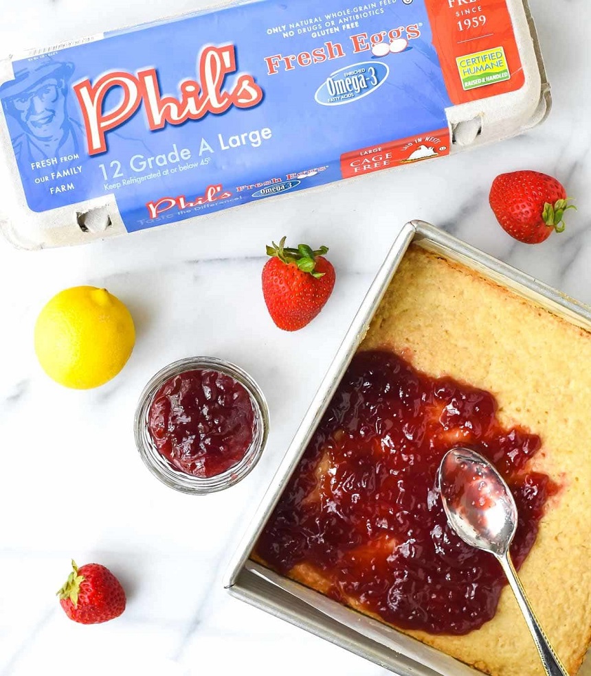 Într-un, se pune făina, zahărul pudră, 1/4 linguriţă de coajă de lămâie rasă, sarea şi untul. Se mixează până ce toate ingredientele se combină perfect şi untul se integrează perfect. Amestecul obţinut se întinde, în mod uniform, în tava de copt şi se coace timp de aproximativ 20-22 de minute. După ce acesta s-a rumenit, se scoate din cuptor şi se lasă timp de 15 minute să se răcească. Deasupra se întinde, în mod uniform, un strat generos de gem de căpșuni,