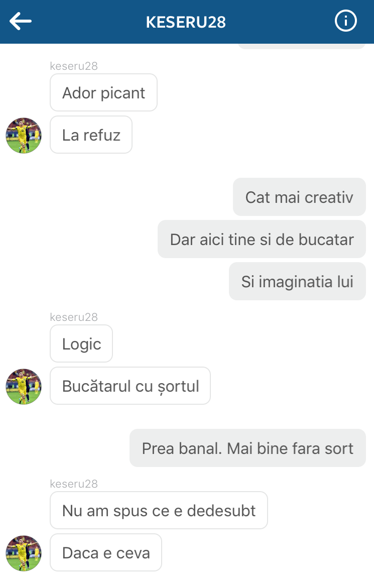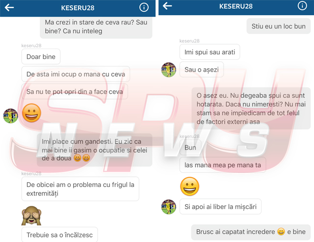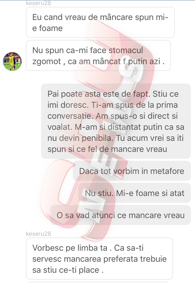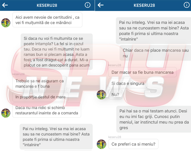 "Eu când vreau de mâncare spun că mi-e foame. Nu spun că-mi face stomacul zgomot, că am mâncat foarte puţin azi. Vorbesc pe limba ta. Ca să-ţi servesc mâncarea preferată trebuie să ştiu ce-ţi place. Aici avem nevoie de certitudini. Că vei fi mulţumită de ce mănânci. Trebuie să ne asigurăm că mâncarea e foarte bună. Dacă nu, mă ridic şi schimb restaurantul înainte de a comanda", i-a spus atacantul, printre figuri de stil. "Vrei să mă iei acasă sau să ne cunoaştem mai bine? Asta ar putea să fie prima şi ultima noastră întâlnire", i-a răspuns tânăra. "Dar măcar să fie bună mâncarea. Şi dacă e singura. Nu? Ce preferi ca şi meniu?", a întrebat-o Keşeru, ceva mai curajos.