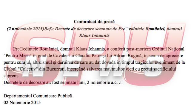 "Președintele României, domnul Klaus Iohannis, a conferit post-mortem Ordinul Naţional „Pentru Merit” în grad de Cavaler lui Claudiu Petre şi lui Adrian Rugină, în semn de apreciere pentru curajul, altruismul şi dăruirea de care au dat dovadă în timpul tragicului eveniment de la Clubul „Colectiv” din Bucureşti, încercând salvarea mai multor vieţi cu preţul sacrificiului suprem. Decretele de decorare au fost semnate luni, 2 noiembrie a.c. ", se arată în comunicatul remis de Administraţia Prezidenţială.