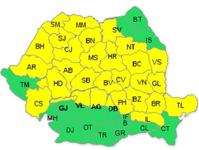 Avertizarea cod galben a fost emisă pentru judeţele Tulcea, Brăila, Ialomiţa, Prahova, Buzău, Vrancea, Galaţi, Vaslui, Bacău, Neamţ, Suceava, Harghita, Covasna, Braşov, Sibiu, Mureş, Bistriţa-Năsăud, Maramureş, Satu Mare, Sălaj, Cluj, Alba, Hunedoara, Bihor, Arad şi Caraş-Severin. Sub avertizare cod galben vor fi şi zone limitate din nordul judeţelor Gorj, Vâlcea, Argeş şi Dâmboviţa şi din estul judeţului Timiş.
