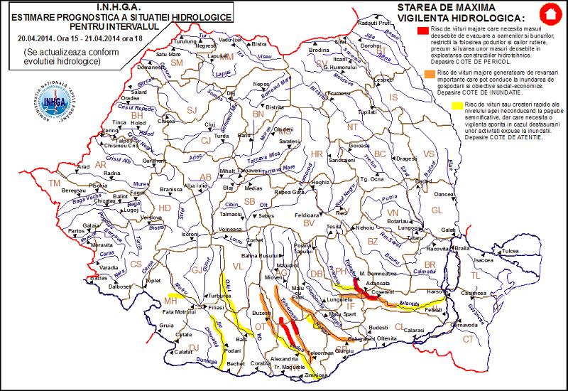Se menţine CODUL ROŞU pe râul Câinelui sectorul amonte SH Vartoapele – confluenţa cu râul Vedea, judeţul Teleorman, în intervalul 21.04.2014 10:00 - 21.04.2014 22:00, pentru următoarele comune: Silistea Gumesti, Ciolanesti, Necsesti, Vartoape, Calinesti, Mavrodin.