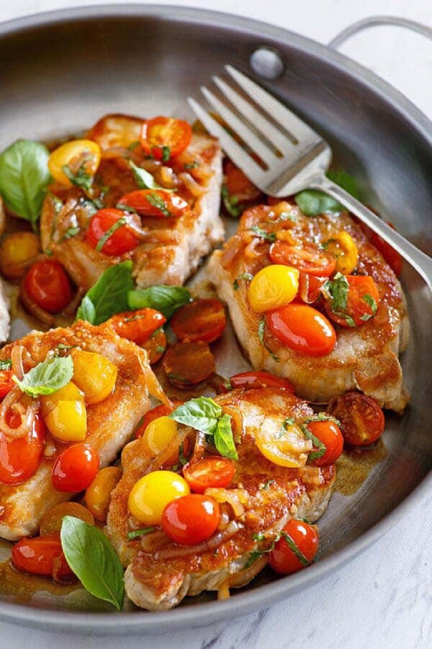 Se condimentează carnea cu ¼ linguriță de sare și ¼ linguriță de piper. Într-un wok se încălzește uleiul, la foc mediu. Se adaugă bucățile de carne și se gătesc aproximativ 5-7 minute pe fiecare parte. După ce carnea este gata se transferă pe un platou de servire. În tigaie se adaugă o lingură de ulei, roșiile, usturoiul, ceapa, sarea și piperul. Se călesc legumele timp de aproximativ 2-3 minute. Se adaugă oțetul balsamic și se amestecă bine. Se lasă pe foc timp de două minute până ce roșiile se înmoaie. Se îndepărtează de pe aragaz și se adaugă busuiocul proaspăt. Se pun legumele în mod egal peste fiecare bucată de cotlet și se servește imediat alături de orez.