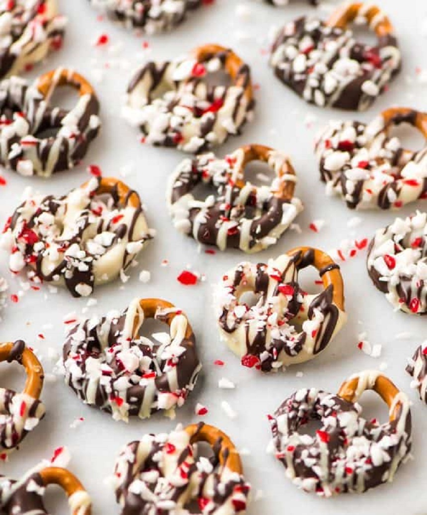 Într-un bol mic, se pune ciocolata împreună cu 1 ½ lingurițe de ulei de nucă de cocos și se introduce în cuptorul cu microunde pentru aproximativ 30 de secunde. După ce aceasta s-a topit se amestecă cu ½ sirop de mentă. Se repetă acest proces și cu ciocolata albă. După ce s-a pregătit glazura de ciocolată, jumătate din cantitatea de covrigei se scufundă, pe jumătate, în glazura albă, apoi se așează pe o hârtie de copt. Cu ajutorul unei furculițe se decorează cu glază de ciocolată neagră, iar apoi și se presară deasupra bucățelele de mentă obținute din drajeurile zdrobite. Se repetă operațiunea și cu restul covrigeilor, numai că de această dată se scufundă, pe jumătate, în glazura de ciocolată neagră și se decorează cu glazură de ciocolată albă. Timp de 30 de minute se lasă covrigeii pe foaia de copt până ce glazura se întărește, apoi se transferă pe un platou de servire.