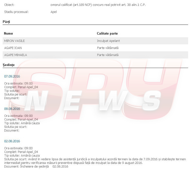 Chiar dacă decizia judecătorilor nu este definitivă, Vasile Miron are probleme în a convinge vreun avocat să-l reprezinte în faţa Curţii de Apel Iaşi. Motiv pentru care instanţa a amânat până acum de două ori judecarea apelului în dosarul în care bărbatul de 44 de ani este acuzat de omor.