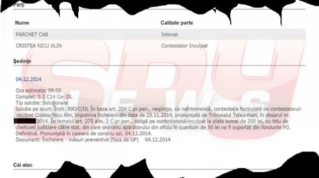 "În baza art. 204 C.pr.pen., respinge, ca neîntemeiată, contestaţia formulată de contestatorul-inculpat Cristea Nicu Alin, împotriva încheierii din data de 25.11.2014, pronunţată de Tribunalul Teleorman. În temeiul art. 275 alin. 2 C.pr.pen., obligă pe contestatorul-inculpat la plata sumei de 200 lei, cu titlu de cheltuieli judiciare către stat, din care onorariu apărătorului din oficiu în cuantum de 50 lei va fi suportat din fondurile MJ. Definitivă", se arată în încheierea de şedinţă.