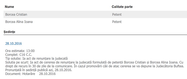 Cristi Borcea şi soţia lui, Alina, au depus la finele săptămânii trecute, în dosarul de divorţ aflat pe rolul Judecătoriei Buftea, câte o cerere în care au precizat că doresc să renunţe la proces. "Ia act de cererea de renunţare la judecată formulată de petenţii Borcea Cristian şi Borcea Alina Ioana. Cu drept de recurs în 30 de zile de la comunicare. În cazul promovării căii de atac cererea se va depune la Judecătoria Buftea", au menţionat magistraţii în decizia are a stat la baza sistării procesului. Semn că cei doi au ajuns la concluzia că le stă mai bine împreună. Cel puţin, pe hârtie...