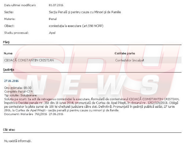 După ce ani de zile s-a război cu rudele fostei sale soţii, Cioacă pare că a ajuns la sentimente mai bune. Zilele trecute, fostul poliţist şi-a retras contestaţia la executare împotriva deciziei prin care, în iunie 2014, a fost condamant la 15 ani şi opt luni de închisoare pentru uciderea Elodiei Ghinescu şi plata a 380 de mii de euro despăgubiri morale către familia Elodiei (150.000 de euro Emiliei Ghinescu, mama Elodiei, 100.000 de euro fratelui Elodiei, Robert, şi 130.000 de euro fiului său, Patrick). Un semn poate că Ciocă este dispus să accepte decizia prin care a fost trimis în spatele gratiilor. În orice caz, pentru a acoperii aceste datorii, Cioacă ar putea ajunge să vândă toate bunurile pe care le are.