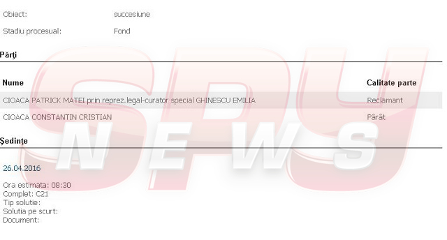 Fostul poliţist ar putea ajunge din nou în faţa judecătorilor în procesul deschis pe numele său de băiatul pe care îl are cu Elodia Ghinescu. Dosarul a fost reintrodus pe rolul Judecătoriei Braşov după ce procesul a fost suspendat în 2013. Patrick Cioacă cerea atunci efectuarea succesiunii, la mijloc fiind bunurile care i-au aparţinut mamei sale. Termenul de judecată a fost stabilit pentru 26 aprilie.