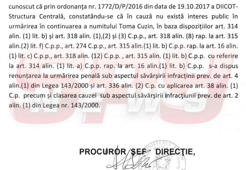 Recent, SPYNEWS a dezvăluit (vezi articolul aici) că judecătorii au confirmat decizia procurorilor în dosarul lui Cuzin Toma, actorul scăpând definitiv de problemele cu legea. „Confirmă ordonanţa nr.1772 D/P/2016 din data de 19.10.2017 a Parchetului de pe lângă Înalta Curte de Casaţie şi Justiţie DIICOT – Structura Centrală, de renunţare la urmărire penală faţă de inculpatul Toma Cuzin, inclusiv în ceea ce priveşte obligarea la plata cheltuielilor judiciare. În baza art.275 alin.3 C.p.p. cheltuielile judiciare rămân în sarcina statului. Definitivă", a fost verdictul judecătorilor.
