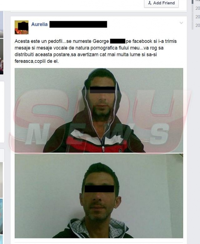 Perversul a intrat în atenţia poliţiei încă de anul trecut, când o femeie a reclamat că acesta i-a trimis mesaje porcoase fiului ei. Femeia care a dezvăluit că băieţelul ei a fost agăţat de pedofil pe Internet a distribuit în spaţiul virtual şi imagini cu tânărul suspectat de corupţie sexuală, postând următorul comentariu: "Acesta este un pedofil... Se numeşte George ... pe Facebook şi i-a trimis mesaje şi mesaje vocale de natură pornografică fiului meu... Vă rog să distribuiţi această postare, să avertizăm cât mai multă lume şi să-şi ferească de el copiii".