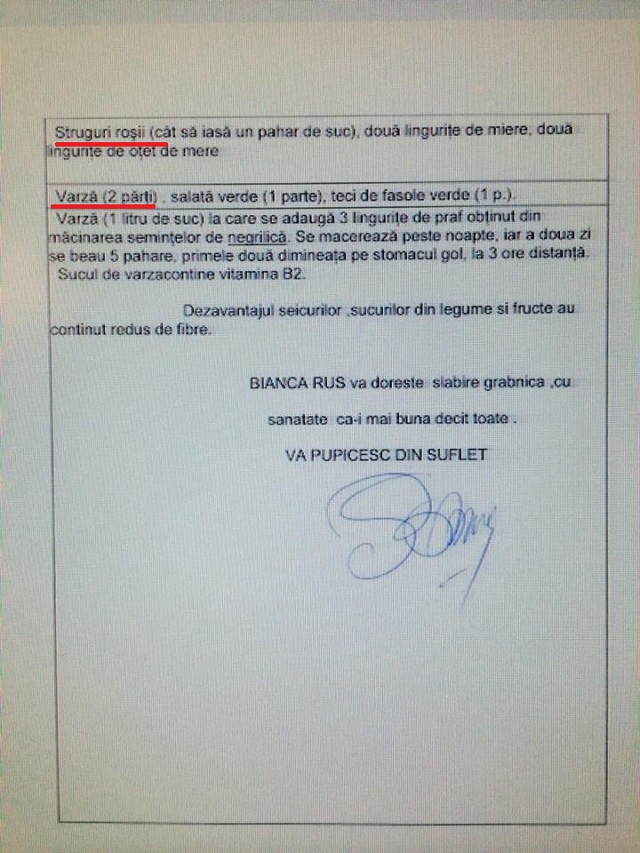 "Această dietă este sănătoasă, însă doar dacă este diversificată. Pe termen scurt, poţi slăbi cu aceste sucuri naturale, însă oricând poţi să te îngraşi. Mai mult decât atât, acestea nu conţin fier, ceea ce poate duce în timp la o anemie, iar lipsa calciului - la osteoporoză. Nu mai punem la socoteală că poţi avea probleme cu vasele de sânge şi creier. Într-adevăr, ajungi să slăbeşti jumătate de kilogram, cel mult un kilogram pe săptămână. Nu cred în această slăbire a Biancăi Rus, aşa, peste noapte, cu aceste sucuri. Nu m-ar mira să îşi fi făcut o micşorare a stomacului. Nu recomand această dietă", a declarat nutriţionistul vedetelor, Cristi Mărgărit.