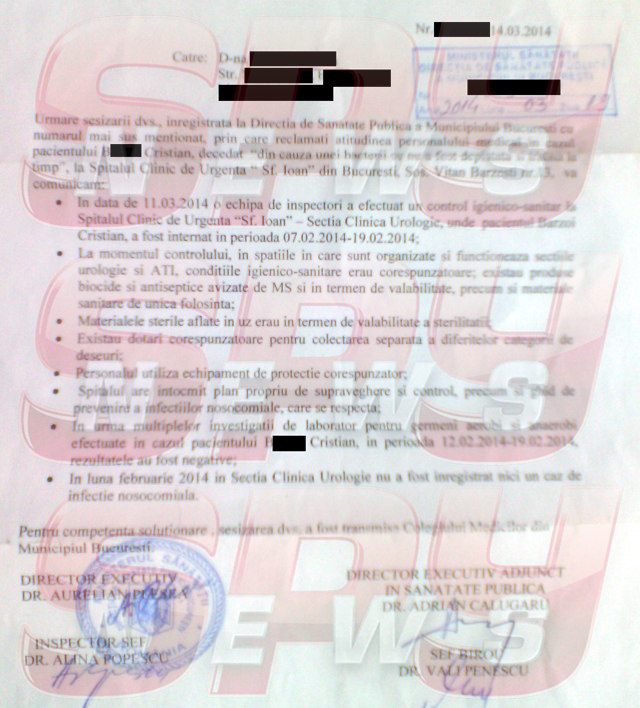 "În spaţiile în care sunt organizate şi funcţionează secţiile urologie şi ATI, condiţiile igienico-sanitare erau corespunzătoare; existau produse biocide şi antiseptice avizate de MD şi în termen de valabilitate (cele livrate de Hexi Pharma - n.r.), precum şi materiale sanitare de unică folosinţă. (...) Spitalul are întocmit plan propriu de supraveghere şi control, prcum şi ghid de prevenire a infecţiilor nosocomiale, care se respectă. În urma multiplelor investigaţii de laborator pentru germeni aerobi şi anaerobi efectuate în cazul pacientului B. Cristian, în perioada 12.02.2014-19.02.2014 (ziua în care a fost internat, respectiv ziua în care a decedat acesta - n.r.), rezultatele au fost negative", se menţionează în documentul intrat în posesia SPYNEWS.