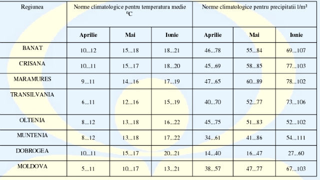 Temperatură aerului va fi apropiată de normalul climatologic în sud-est și local în sudul și vestul țării, iar în celelalte regiuni va avea valori sub mediile multianuale ale perioadei.Cantitățile lunare de precipitații vor fi excedentare în cea mai mare parte a țării,exceptând regiunile sud-estice și sudice, unde se vor situa, în general, în apropiereamediilor multianuale.