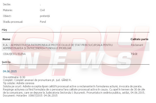 Zilele trecute, Elena Ceauşescu a câştigat unul dintre procesele deschise pe numele ei de către RA-APPS ca urmare a faptului că nu ar mai fi plătit chirie de pestre trei ani. Instanţa a admis o excepţie ridicată de avocaţii acesteia şi a respins acţiunea în "pretenţii" a Administraţiei Patrimoniului Protocolului de Stat. Decizia nu este definitivă. Soţia generalului Ilie Ceauşescu se judecă cu RA-APPS - în mai multe dosare - încă din 2009, an în care regia a majorat chiria imobilelor din administrare. Nemulţumită, femeia ar fi sistat plăţile până la rezolvarea în instanţă a conflictului.