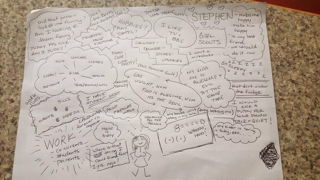 În imagine, aceasta a desenat o femeie înconjurată de o mulţime de bule în care sunt redate gândurile care-i vin în minte, precum: "Stephen mă face fericită, eu îl fac fericit, este prietenul meu, am putea face asta acum" / "E mizerie în casă. Toatre sunt la întâmplare" / "Disney, Disney" / "Unde o fi chestia aia pe care o caut de doi ani?"