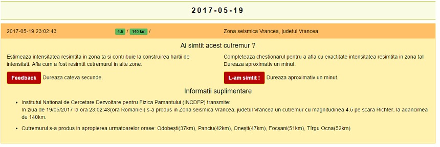 Potrivit Institutului Naţional pentru Fizica Pământului, seismul a avut loc la adâncimea de 168.9km şi a avut epicentrul în zona judeţului Vrancea.