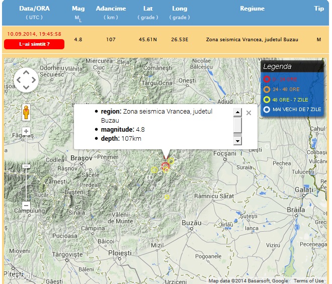 UPDATE: Site-ul Institutului Național de Fizică a Pământului arată că seismul a avut 4.8 grade pe scara Richter şi s-a produs în zona Vrancea, la 107 kilometri adâncime.