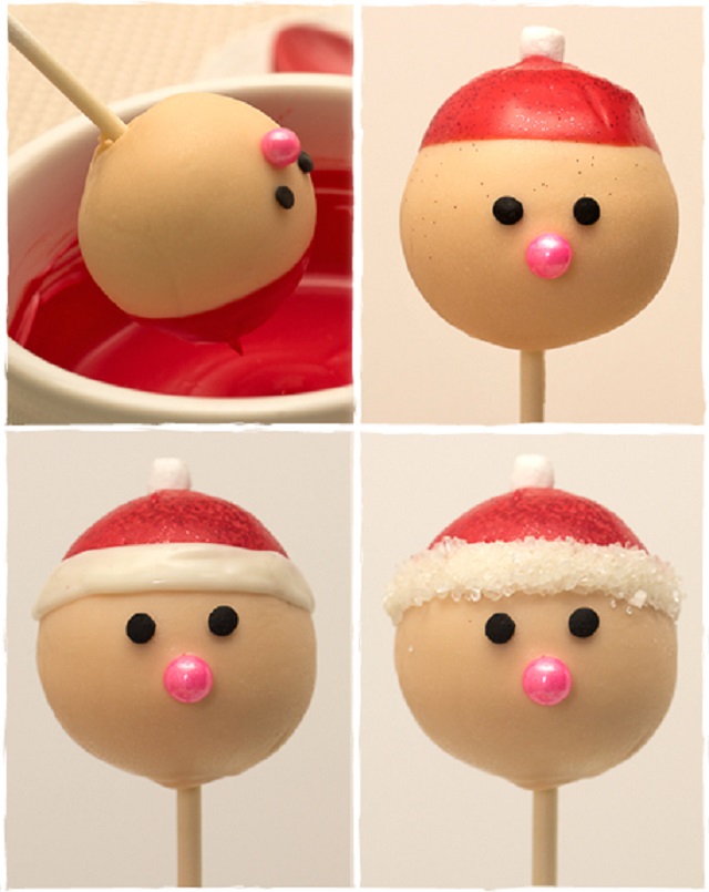Acum va trebui să foloseşti glazură roşie şi să scalzi fiecare bomboană "cu capul" în glazură, astfel încât să pară că are căciulă. Adaugă în vârful căciulii un jeleu moale, alb.