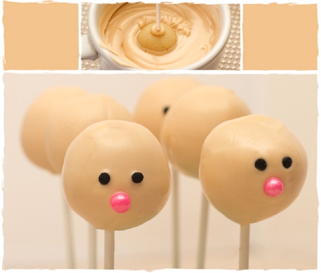 Pune fiecare biluţă pe câte un băţ, după care decorează-le cu perluţele de zahăr, astfel încât să formezi un chip cu ochi şi nas. Foloseşte-te de pensetă ca să iei perluţele şi să pui confetti negre pe post de ochi.
