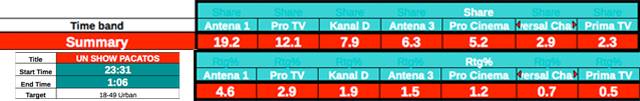 Rating (RTG%) reprezintă numărul mediu de telespectatori pe minut ai unei emisiuni (sau interval orar) difuzată de o staţie TV. Ratingul poate fi exprimat în cifre absolute (mii telespectatori) sau ca procent din targetul analizat.