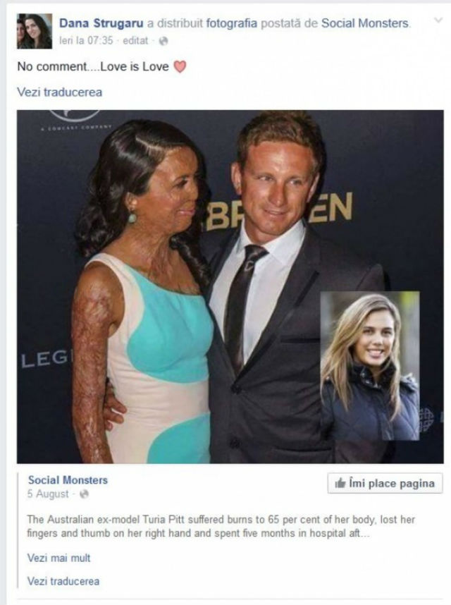 Aceasta a postat o imagine în care apare un cuplu, femeia fiind având cicatrici de la arsuri. "Dragostea este dragoste", este mesajul care însoţeşte imaginea pe care Dana a publicat-o pe pagina ei.