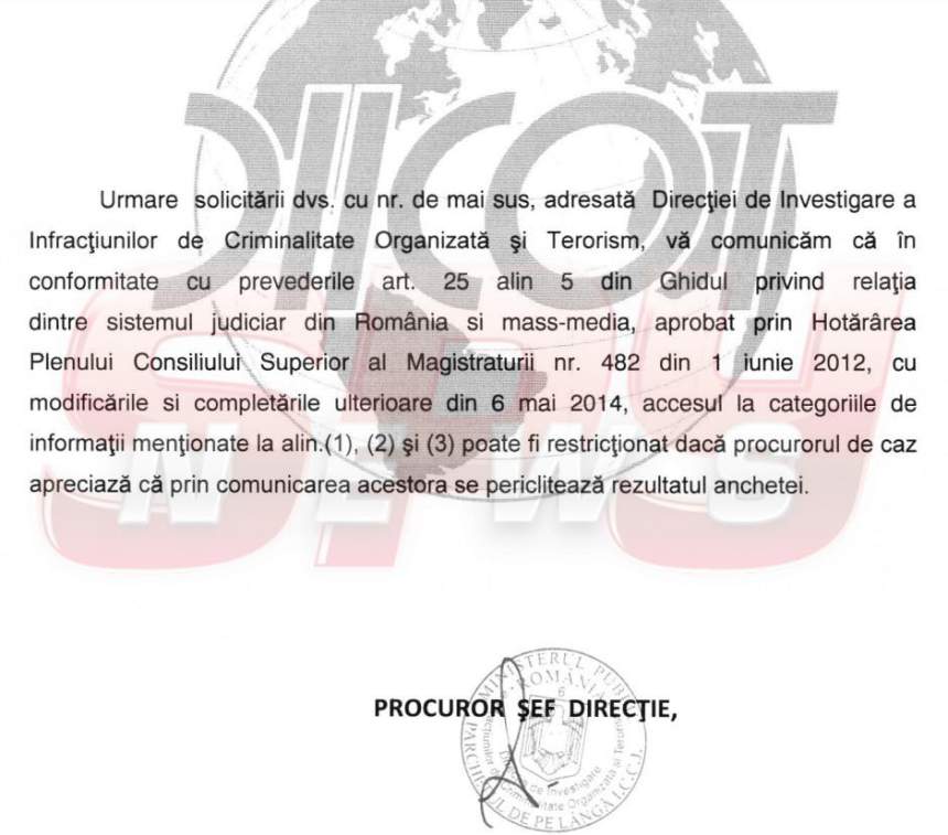 Ieri, la 40 de zile după ce au primit solicitarea (depăşind cu doar 10 zile termenul prevăzut de lege), procurorii DIICOT au recunoscut, într-un limbaj de lemn greu de digerat, invocând hotărâri şi articole, că au minţit pentru a nu periclica o anchetă care, la momentul respectiv, era în plină desfăşurare! "(...) Vă comunicăm că (...) accesul la categoriile de informaţii (de interes public – n.r.) poate fi restricţionat dacă procurorul de caz apreciază că prin comunicarea acestora se periclitează rezultatul anchetei", a fost răspunsul DIICOT. (facsimil jos)