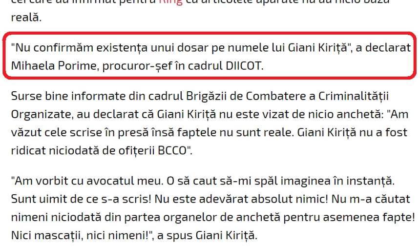 În încercarea de a afla adevărul, reporterii SPYNEWS au solicitat o explicaţie procurorilor DIICOT, în condiţiile în care instituţia amintită îi făcea mincinoşi pe toţi jurnaliştii care au scris despre scandalul penal a lui Kiriţă şi îi luau acestuia apărarea, declarându-l curat ca lacrima.