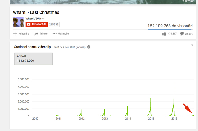 Putem vedea clar în statisticile pieselor "Mariah Carey - All i want for Christmas is you", "Wham! - Last Christmas", dar și în cele autohtone, cum ar fi "Asta-i seara de Crăciun", creșteri semnificative ale traficului. Asta înseamnă că simțim nevoia să le ascultăm chiar dacă este abia 4 Noiembrie!