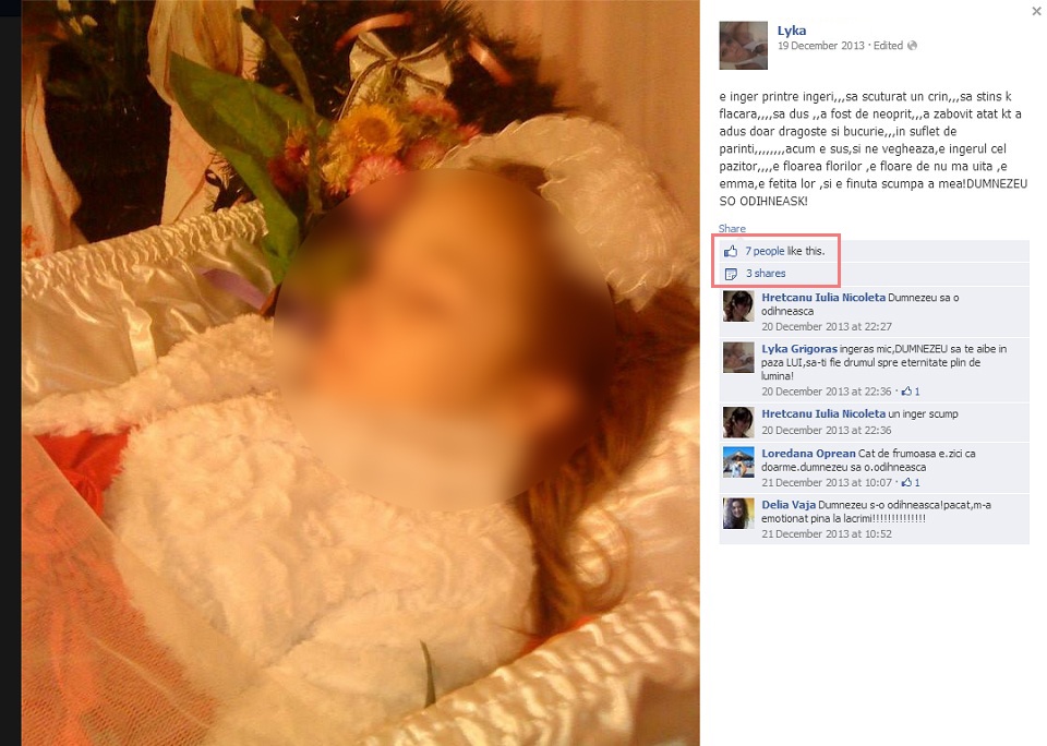 Reporterii spynews v-au prezentat ieri dubiosul gest al unei femei de a posta pe internet poze cu fina ei minoră în sicriu. Între timp, am aflat trista poveste a micuţei, dar şi motivul pentru care naşa a expus-o în asemenea mod!