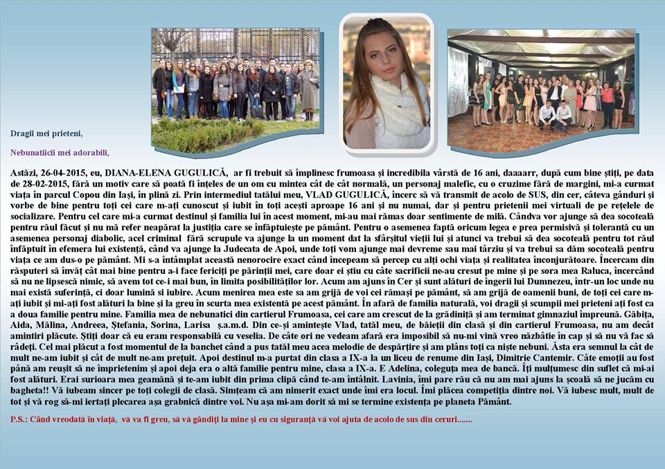 "Astăzi, 26.04.2015, eu, Diana-Elena Gugulică, ar fi trebuit să împlinesc frumoasa şi incredibila vârstă de 16 ani, daaar, după cum bine ştiţi, pe data de 28.02.2015, fără un motiv care să poate fi înţeles de un om cu mintea cât de cât normală, un persosonaj malefic, cu o cruzime fără margini, mi-a curmat viaţa în parcul Copou din Iaşi, în plină zi. Prin intermediu tatălui meu, Vlad Gugulică, încerc să vă transmit de acolo de Sus, din cer, câteva gânduri şi vorbe de bine pentru toţi cei care m-aţi cunoscut şi iubit în toţi aceşti aproape 16 ani şi nu numai, dar şi pentru prietenii mei virtuali de pe reţelele de socializare. Pentru cel care mi-a curmat destinul şi familia lui în acest moment, mi-au rămas doar sentimente de milă. Cândva vor ajunge să dea socoteală pentru tot răul înfăptuit în efemera lui existenţă".