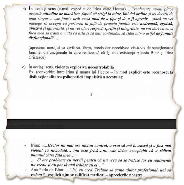 Dovadă stă conversaţia halucinantă dintre mama lui şi femeia căreia i-a oferit o minunăţie de copil. "Hector nu mai are niciun control, a vrut să mă lovească şi a fost mai violent ca niciodată. Îmi este frică, nu este deloc acceptabil că a ridicat pumnul către faţa mea. El are probleme cu nervii pentru că nu vrea să se trateze, iar eu realmente nu vreau şi nu pot să mai trăiesc cu el", i-ar fi spus Irina soacrei ei, în urma unui scandal cu soţul mexican. "Iri, eu cred. Trebuie să caute ajutor profesional. Hai să vedem", i-a răspuns Ana Perla de Bitar, fiind îngrijorată de starea fiului ei.