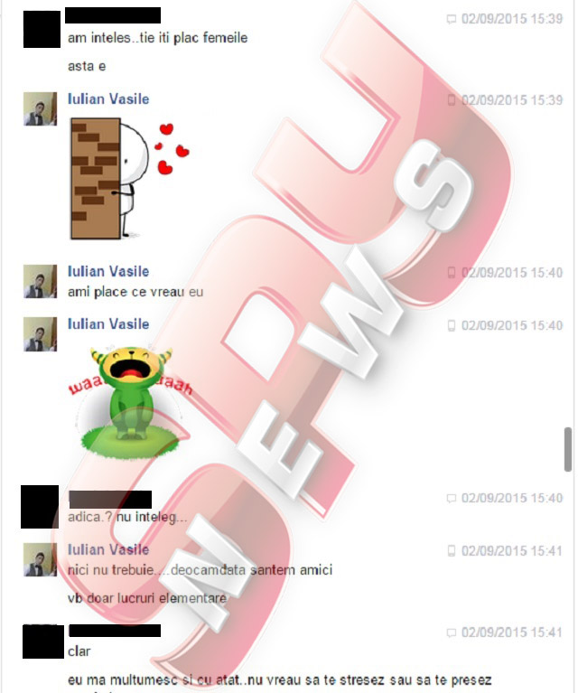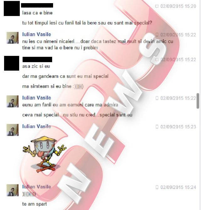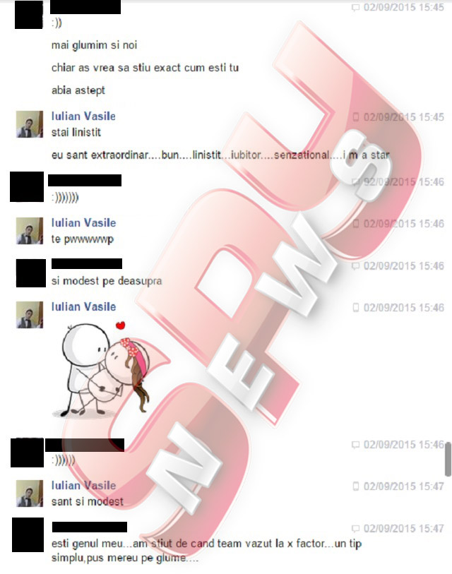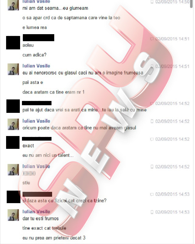 Pe adresa de pont a redacţiei, [email protected], un cititor a trimis câteva conversaţii halucinante care au avut loc între Iulian Vasile şi un homosexual, pe un site de socializare. După ce s-au împrietenit, artistul a ţinut să îi precizeze tânărului că arată foarte bine în fotografii, fiind invidios pe fizicul tânărului gay. După un schimb de replici şi câteva glume, Iulian a vrut să îi demonstreze noului prieten că nu este vorba de un cont fals, aşa că i-a lăsat un număr de contact, pentru a-l verifica. Şi nu s-a oprit aici. "Eu sunt. Când vrei, putem ieşi la o bere. Să murim de râs. Eu sunt foarte natural de fel", i-a scris Iulian, extrem de sincer.