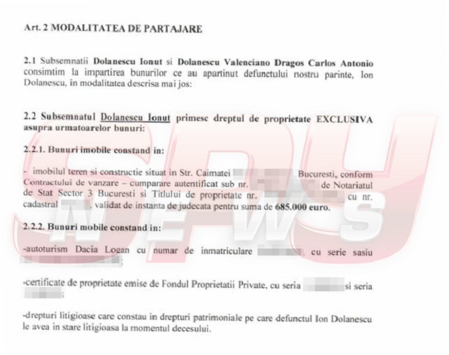 - Dolănescu Valenciano Dragoş Carlos Antonio, împreună cu urmaşii săi direcţi, vor avea dreptul să încasese ca unici beneficiari (...) toate drepturile patrimoniale izvorâte din reproducerea, distribuirea, radio-difuzarea pieselor muzicale rezultate din interpretarea directă a defunctului său tată, Ion Dolănescu". În plus, Ionuţ îi va achita lui Dragoş 150.000 de euro.