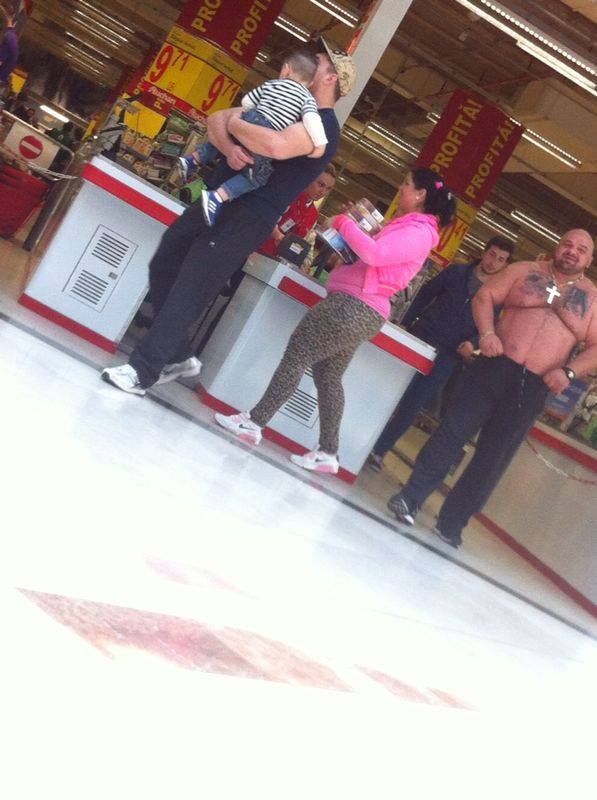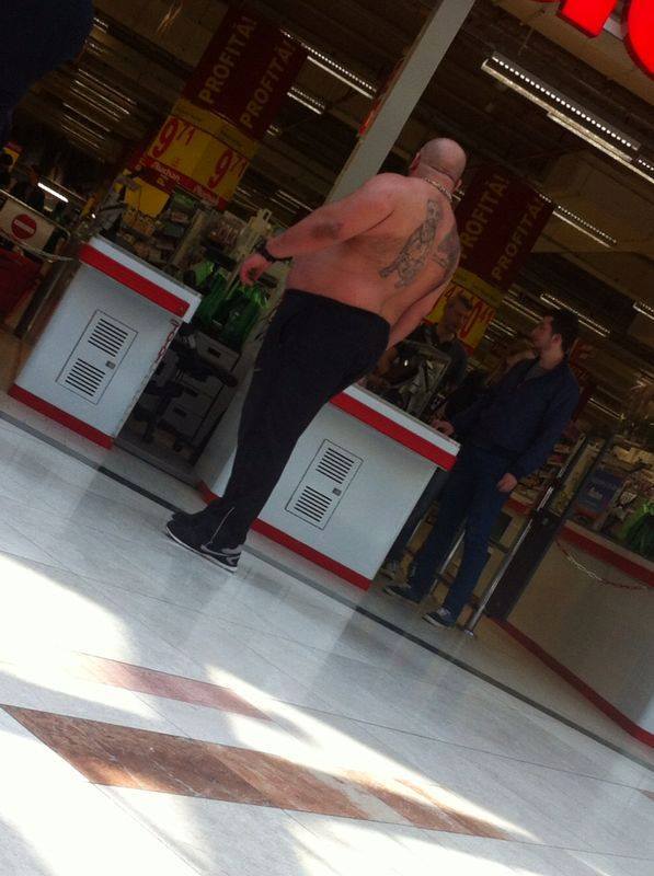 Cu pantaloni negri şi încălţăminte sport şi cu... bustul gol, interlopul a stat, cuminte, la coadă într-un magazin. Ceilalţi clienţi au rămas cu gura căscată şi s-au uitat lung la burta sa care se revărsa peste elasticul patalonilor şi la tatuajele sale de pe spate. Una dintre persoanele care l-au văzut a fost atât de uimită, încât i-a făcut mai multe poze şi le-a publicat pe o reţea de socializare.