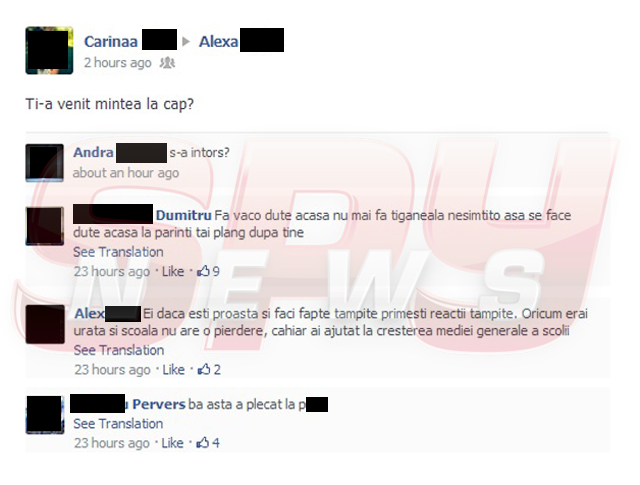 Din fericire, minora dispărută a fost găsită luni seara, în comuna Balcani din judeţul Bacău. Cu toate acestea, colegii săi de şcoală nu sunt deloc încântaţi de revenirea ei. Pe profilul de facebook al Alexandrei pare că se desfăşoară un concurs de invective. "Pe asta nici moartea nu o ia" sau "Asta a plecat la p***" sunt doar câteva dintre "încurajările" pe care le-a primit adolescenta de la colegi. Având în vedere că tocmai comportamentul deloc prietenos al acestora a făcut-o pe Alexandra să sufere atât de tare încât a plecat de acasă, nu este exclus ca "perseverenţa" jignirilor colegilor să o împingă din nou la un gest extrem.