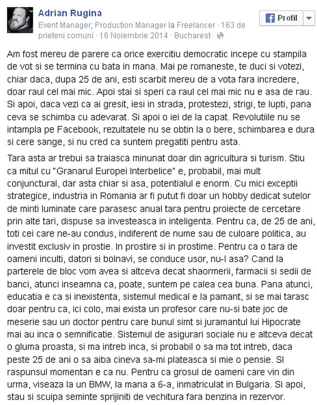 Eroul Adrian Rugină nu încetează să ne uimescă nici după ce prietenii şi rudele l-au dus luni pe ultimul drum. În urmă cu un an, în ziua turului doi al alegerilor prezidenţiale tânărul artist realiza o radiografie a societăţii și a clasei politice din România.