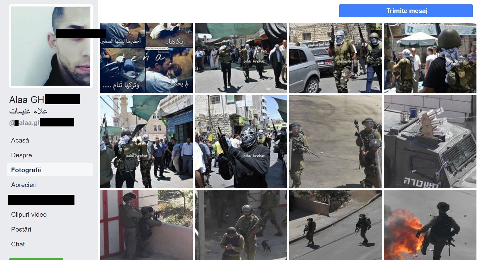Cel mai activ dintre toţi palestinienii de la Academia de Poliţie este Alaa G., care pe una dintre paginile sale de Facebook a postat sute de mesaje şi de imagini cu arabi înarmaţi care luptă în numele lui Allah împotriva israelineilor. (captură jos)