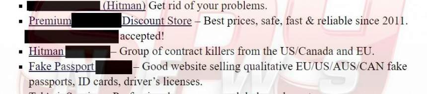 Conform unei enciclopedii de pe Darknet, pe lângă "bazarul" de arme, există şi alte site-uri specializate, în funcţie de infracţiunile comise de membri: unde se vând documente falsificate, unde se vând droguri, unde se distribuie materiale pronografice pentru pedofili şi unde pot fi contactaţi asasini plătiţi!