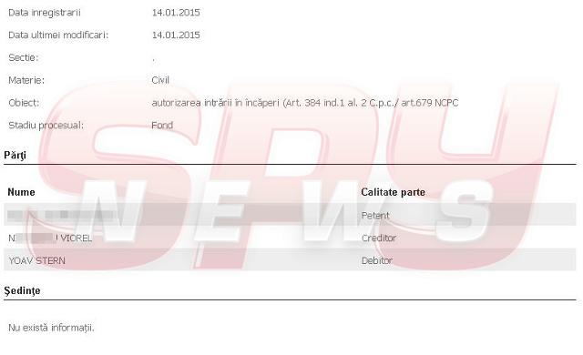 Potrivit informaţiilor descoperite de reporterii spynews.ro, Yoav Shtern va fi executat silit după ce unul dintre vecinii săi l-a dat în judecată. Mai grav, bărbatul a cerut instanţei emiterea unei autorizaţii pentru a putea întra în casa omului de afaceri. Cererea acestuia se află la Judecătoria Sectorului 1. Un prim termen de judecată nu a fost stabilit.