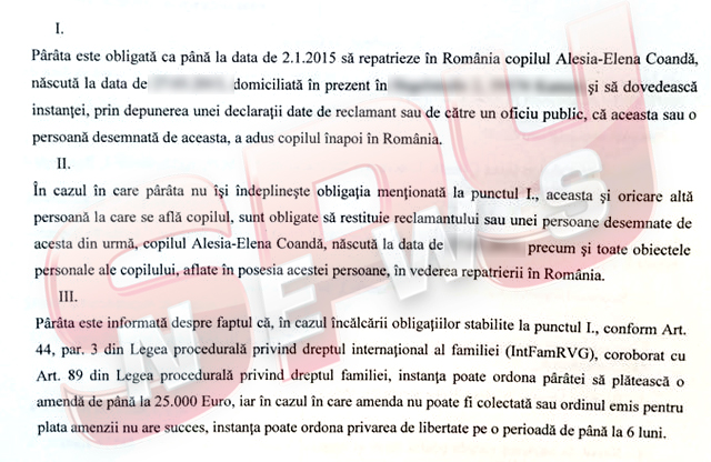 "Pârâta este obligată ca până la data de 2 ianuarie 2015 să repatrieze în România copilul Alesia Coandă şi să dovedească instanţei, prin depunerea unei declaraţii date de reclamant sau de către un oficiu public, că aceasta sau o persoană desemnată de aceasta, a adus copilul înapoi în România", se arată în decizia magistraţilor germani.