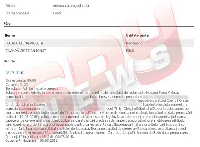 În tot acest timp, Elena Hueanu nu a stat cu mâinile în sân. Chiar dacă în acest moment sunt pe rol două procese, unul la Judecătoria Cornetu şi altul la Judecătoria Sectorlui 2, fostul fotomodel a deschis încă două procese în judeţul Timiş. Unul dintre l-a şi câştigat, în primă instanţă, chiar ieri. "Admite în parte cererea de ordonanţă preşedinţială formulată de Hueanu Elena, domiciliată în judeţul Timiş, împotriva pârâtului Cristi Coandă, domiciliat în Bucureşti. Stabileşte locuinţa minorei la mamă şi obligă pârâtul să contribuie lunar cu 1/4 parte din veniturile nete realizate", se arată în decizia magistraţilor timişeni, care nu este definitivă, ea putând fi atacată în cinci zile.
