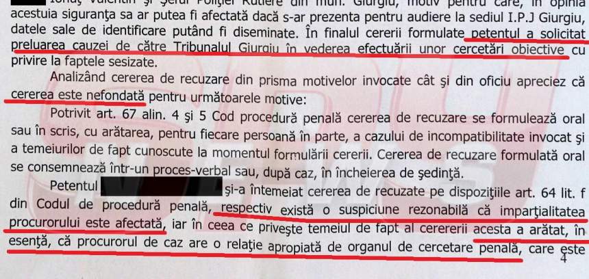 Un caz scandalos, petrecut recent la Inspectoratul de Poliţie al Judeţului Giurgiu, demonstrează că, în faţa sistemului găunos, oamenii de rând nu au nicio şansă. După ce ofiţeri din comanda IPJ Giurgiu au furnizat date confidenţiale unui poliţist de la Circulaţie care avea calitatea de civil într-o petiţie, victima abuzului a făcut plângere penală, in rem, pentru identificarea autorilor şi tragerea acestora la răspundere, pentru abuz în serviciu. Reclamantul a explicat în plângerea penală că persoanele care deţineau informaţiile "sifonate" erau doi şefi de servicii, iar beneficiarul – un ofiţer de la Poliţia Rutieră, indicându-i pe toţi trei, ca martori, pentru a fi audiaţi. Dintre toţi procurorii din Giurgiu, dosarul a ajuns, "surprinzător"!, pe mâna procurorului care supraveghează dosarele Poliţiei Rutiere şi are o relaţie apropiată de beneficiarul abuzului în serviciu. Drept urmare, reclamantul a solicitat recuzarea procurorului şi repartizarea dosarului unui alt magistrat, explicând că relaţia de prietenie profesională dintre anchetator şi anchetat ar putea influenţa rezultatul investigaţiilor. Recent, însă, Anda-Maria Băleanu, prim-procuror al Parchetului de pe lângă Judecătoria Giurgiu, a dat un verdict incredibil: a respins cererea de recuzare, explicând, totodată, că dacă procurorul e prieten cu cel anchetat, nu înseamnă că nu îşi va face meseria ca la carte!